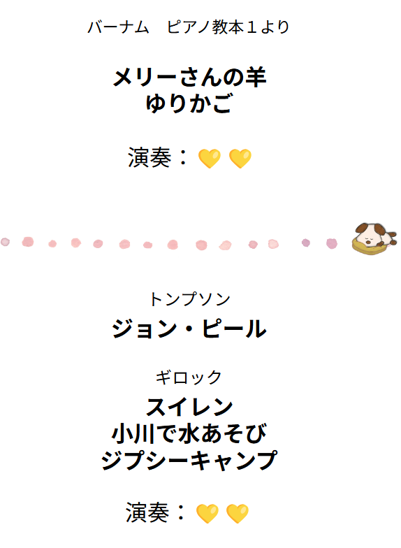 💛💛ちゃんは、最近ますます表現しようとする気持ちが強くなってきて、それに伴って表現の幅がぐっと広がりました。難しい個所もよく練習して、落ち着いて本番に臨んでくれました。今日も「明るくはっきりした音で弾きたい」と意識した箇所(でも先週までうまくいっていなかった箇所)が意図したとおりに演奏できて、とても喜んでいました。かなり緊張して弾き始めたそうですが、そんななかでもきちんと自己分析ができているところは素晴らしいと思いました。